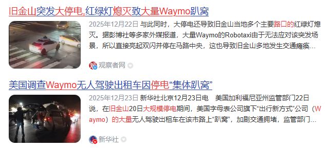 2025年12月,旧金山发生大规模停电,路口的交通信号灯全都熄灭了,结果大量Waymo车辆因为无法处理这种突发场景,全都在十字路口停了下来,直接引发了交通瘫痪,后来Waymo通过软件更新,才稍微优化了这种情况下的车辆应对能力。